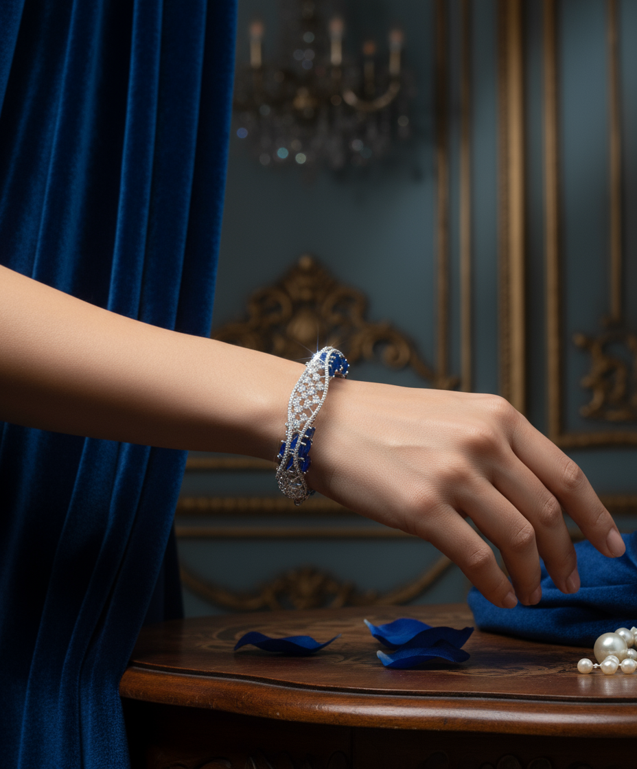 Experience elegance with this captivating 925 silver designer bangle, beautifully adorned with dazzling blue sapphire-like stones and shimmering zircon embellishments. The artistic wave pattern across the band, combined with the intricate lattice design, offers a unique blend of sophistication and modern style. Weighing 15.82 grams, this bangle provides a luxurious feel and is perfect for festive occasions, parties, or elevating your daily look. Make this stunning piece a cherished addition to your jewelry collection and enjoy its timeless allure.