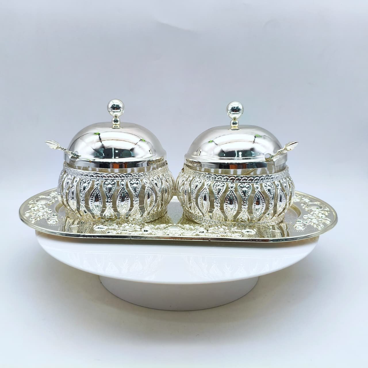 This exquisitely crafted silver condiment set brings a luxurious touch to your dining experience with its ornate dual-bowl design and intricate openwork detailing. Each lidded bowl is paired with a matching spoon and displayed on a beautifully engraved tray—perfect for serving spices, chutneys, or sweets in regal style. The premium silver finish and eye-catching design make this set an ideal centerpiece for festive occasions, family gatherings, or as a memorable gift. Add timeless elegance to your table decor with this statement piece that seamlessly blends functionality and artistic allure.