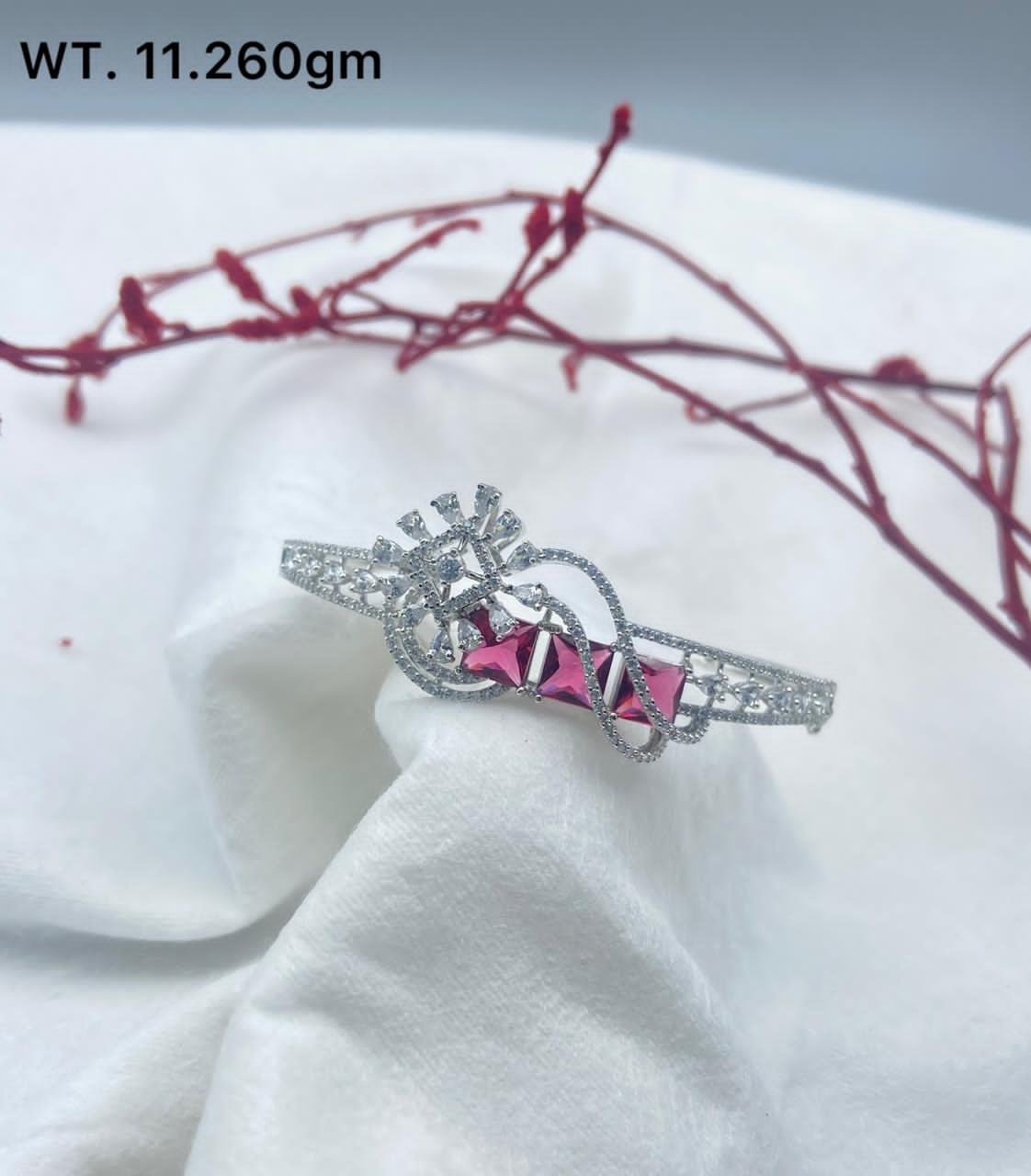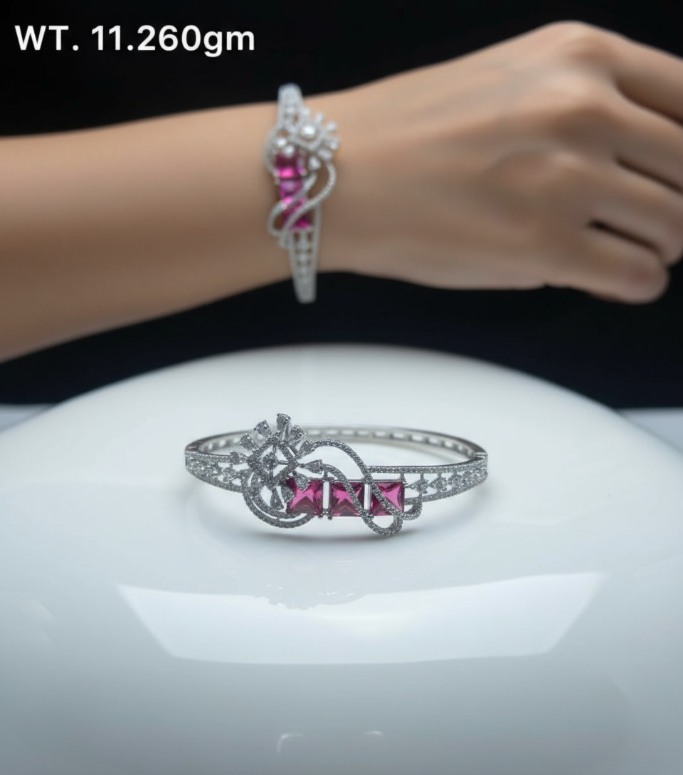 Add a luxurious touch to your jewelry collection with this stunning 925 sterling silver bracelet, elegantly handcrafted and adorned with eye-catching pink gemstones. Weighing 11.26 grams, this unique piece features a dazzling criss-cross motif, encrusted with brilliant pink stones and sparkling white accents, offering a perfect fusion of modern glamour and classic sophistication. The intricate openwork design ensures lightweight comfort and a premium feel, ideal for both casual outings and grand celebrations.