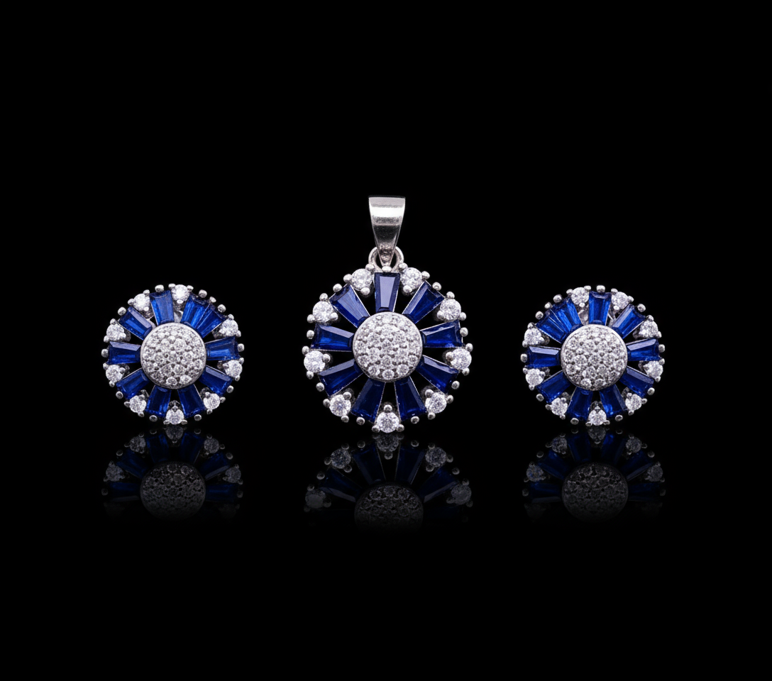 This Royal Blue Radiance Silver Jewelry Set is a timeless addition to any collection, showcasing exquisite craftsmanship and modern elegance. The set consists of a pair of earrings and a matching pendant, each adorned with brilliant royal blue baguette stones arranged in a sunburst motif, complemented by sparkling cubic zirconia in a dazzling central cluster and perimeter. The high-polish silver finish enhances the vibrant blue hues, making this set perfect for special occasions or everyday luxury. this lightweight set offers both style and comfort, making it an ideal gift or personal treat for jewelry enthusiasts seeking refined glamour.